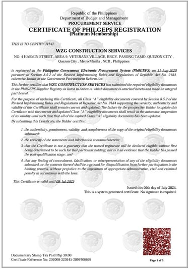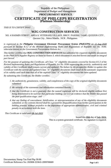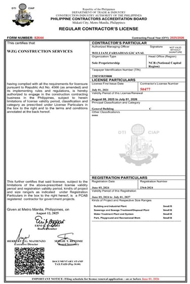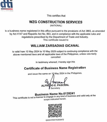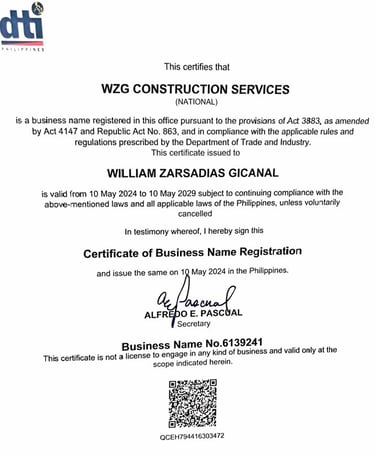 WZG Construction Services was duly registered in the Department of Trade and Industry (DTI) Philippines in May 2019 with Certification No. 03983820. Its main office is located in Quezon City, Philippines.
